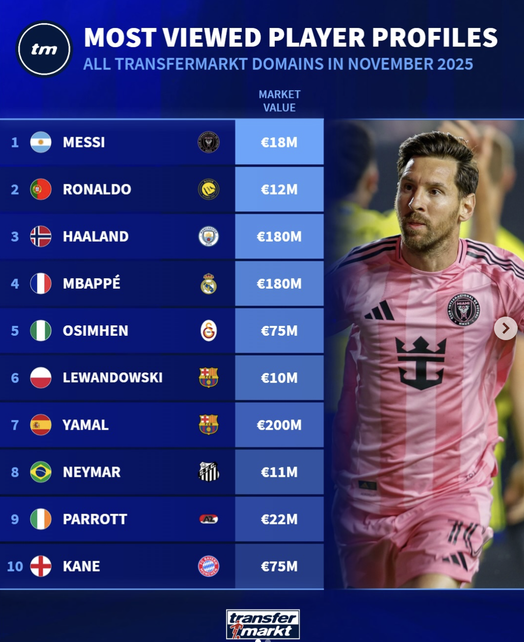 [流言板]德轉11月瀏覽量最多的球星:梅西居首,C羅和哈蘭德排名二三