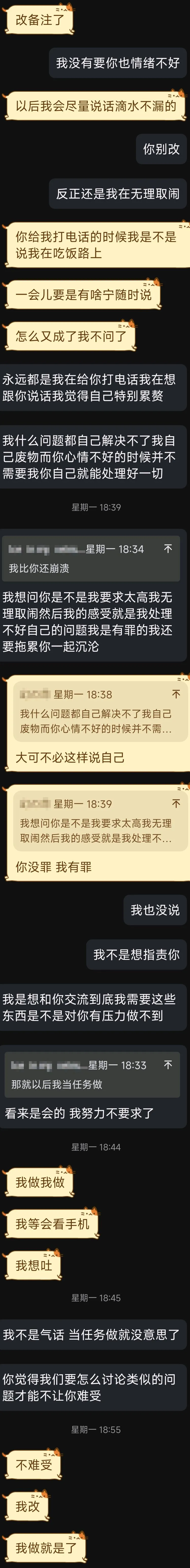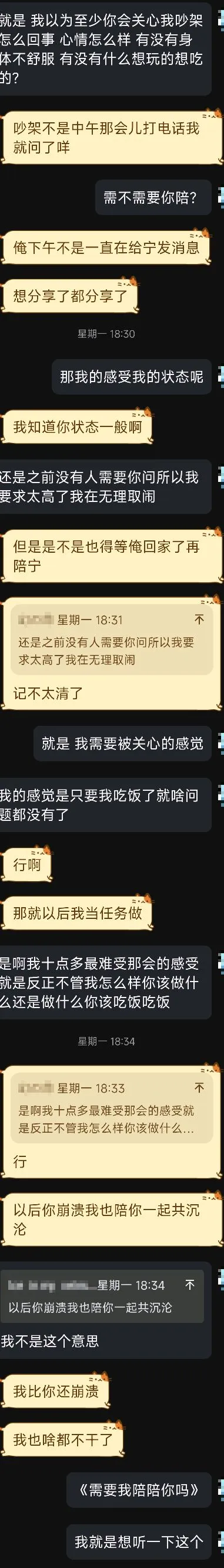 昨天:我和家里人吵架了,給他打電話(huà),他那個(gè)時(shí)候和別人在外面吃飯有點(diǎn)忙,我說(shuō)那等你忙完再說(shuō),他說(shuō)那我有事情隨時(shí)跟他講,然后下午給我分享了一些覺(jué)得比較有意義的小知識【平時(shí)也會(huì )經(jīng)常分享】,晚上的時(shí)候樓主沒(méi)忍住問(wèn)他為什么不能關(guān)心一下我為什么吵架了我下午到晚上情緒狀態(tài)都不太好,聊天記錄如p1p2