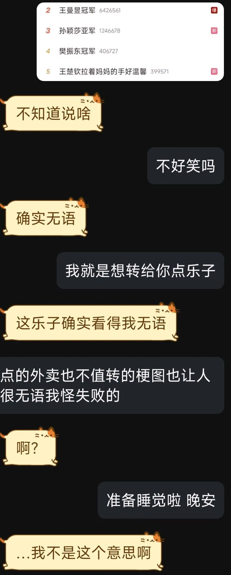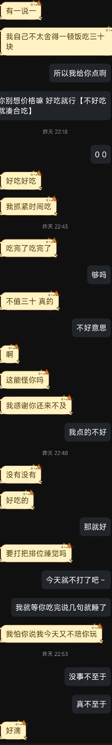 然后他昨晚比較忙所以樓主想讓他高興一點(diǎn)早點(diǎn)休息,就給他點(diǎn)了外賣(mài),給他分享了看到的有意思的圖,聊天記錄如p3p4,因為他這個(gè)回應方式樓主也有點(diǎn)難過(guò)就是覺(jué)得好像自己做的什么都不好,然后后面樓主感覺(jué)不對趕緊給他打電話(huà)就發(fā)現他心態(tài)炸了,他覺(jué)得我老是動(dòng)不動(dòng)就生氣,他不知道怎么跟我說(shuō)話(huà)怎么和我交流,但是我感覺(jué)就算普通朋友幫忙點(diǎn)了個(gè)外賣(mài)難道說(shuō)不值這個(gè)價(jià)錢(qián)聽(tīng)起來(lái)就很正常了嗎……我現在也不知道怎么辦好了,所以請各位jr評價(jià)一下,麻煩友好討論謝謝??!