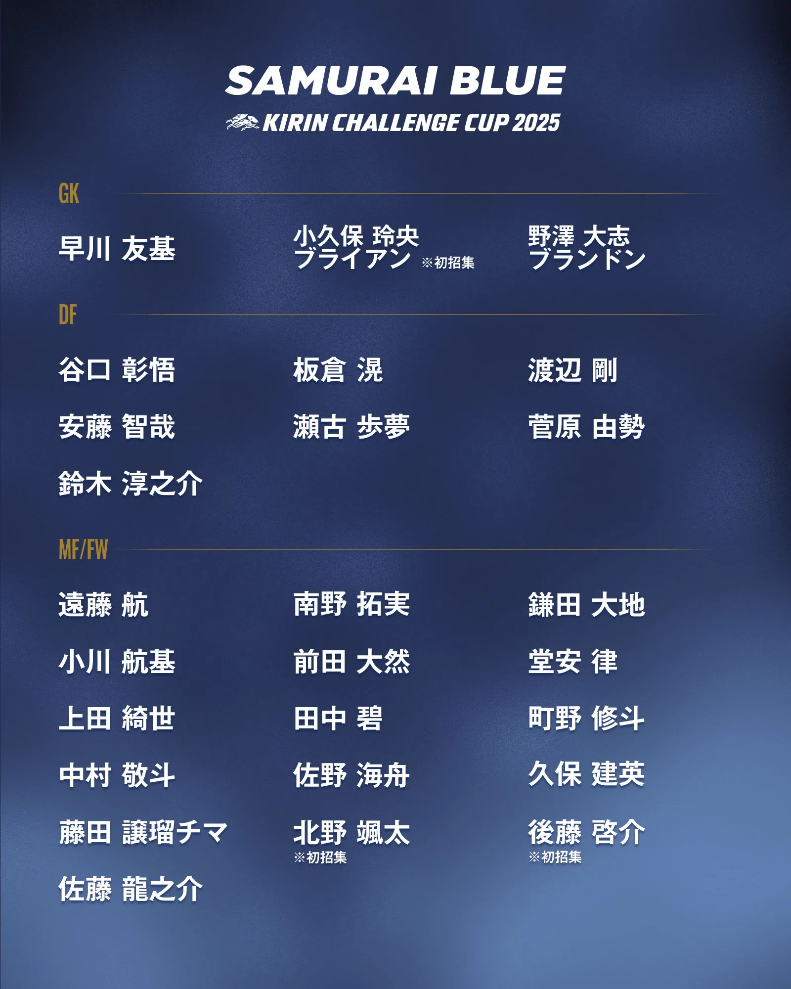 門(mén)將:早川友基(鹿島鹿角)、受傷小久保玲央(圣圖爾登)、野澤野澤大志(安特衛普)