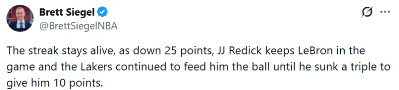 “在落后25分的情況下,紀錄卻得以延續——雷迪克始終將勒布朗留在場(chǎng)上,湖人全隊也持續給他喂球,直至他投進(jìn)一記三分,使其拿到10分?!?/p>
