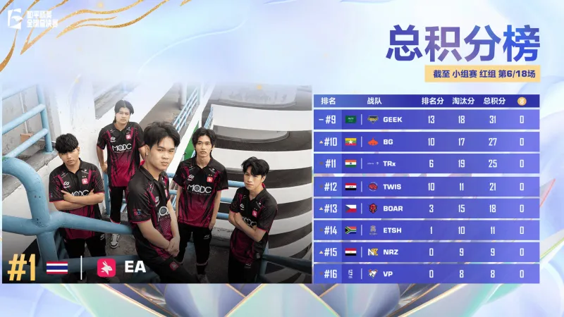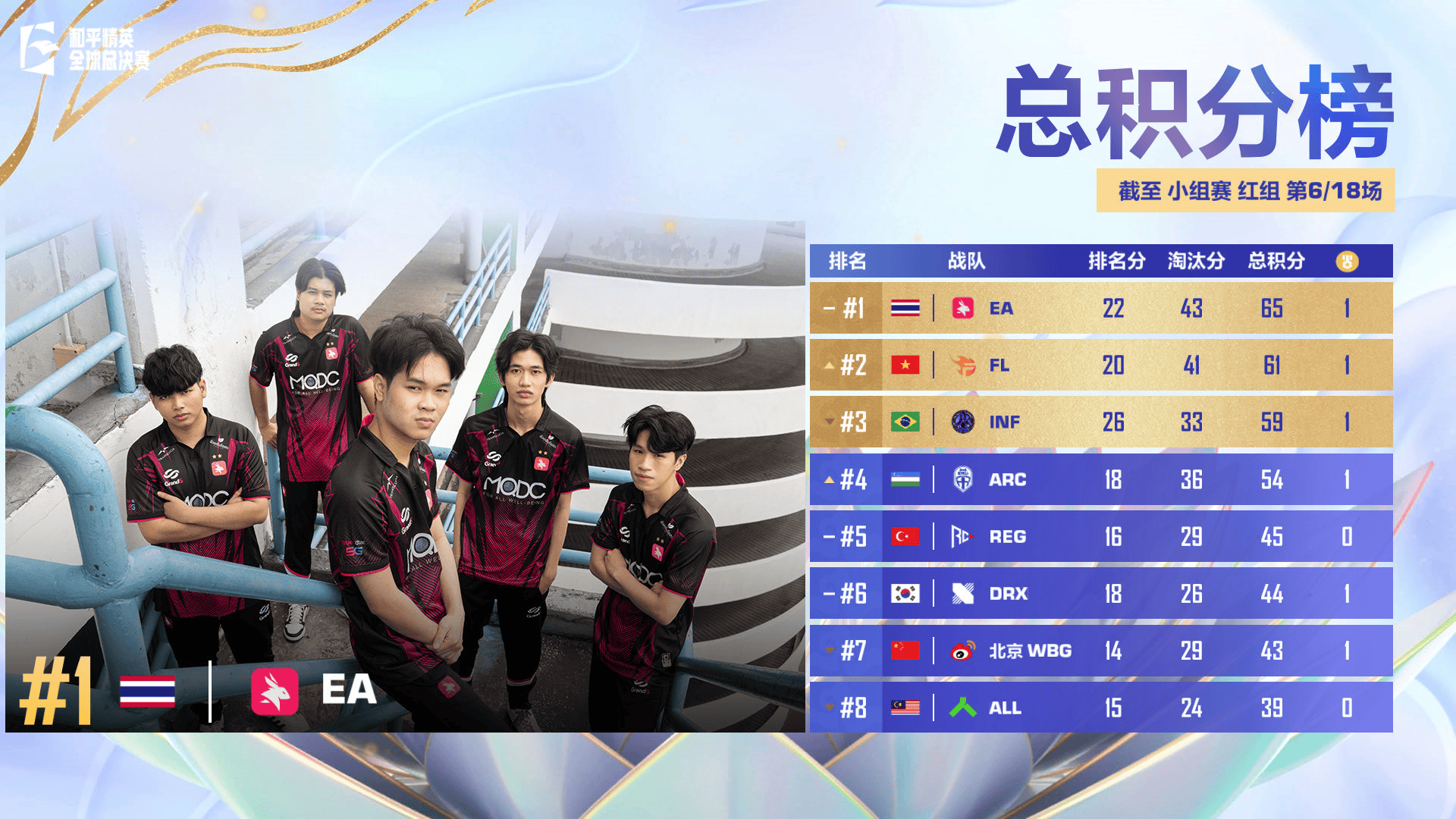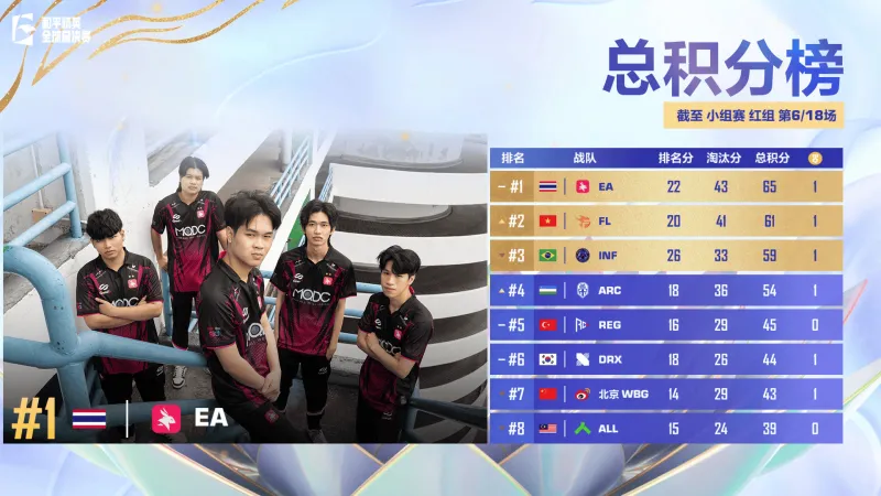 虎撲12月02日訊 12月2日積分榜:2025和平精英全球總決賽-小組賽紅組第1日,WBG第3局吃雞但下半場(chǎng)得分不佳,分榜積43分暫時(shí)排名第7;EA首局神勇發(fā)揮,局吃雞排積分積65分暫居首位;EA/FL/INF分列前三。名第