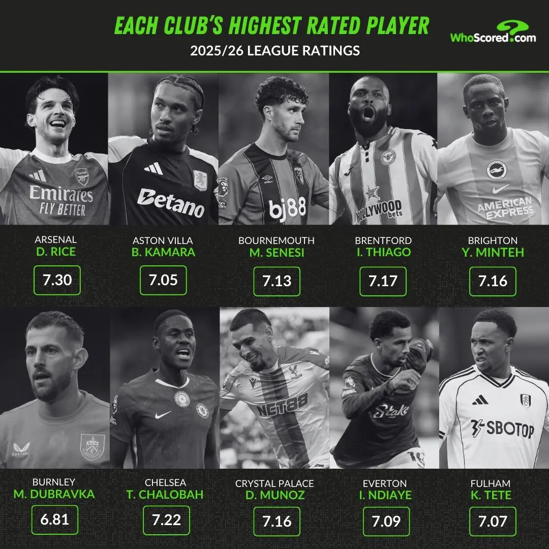 虎撲12月02日訊 WhoScored數據統計,盤(pán)點(diǎn)本賽季至今英超各支球隊評分最高球員。高球
