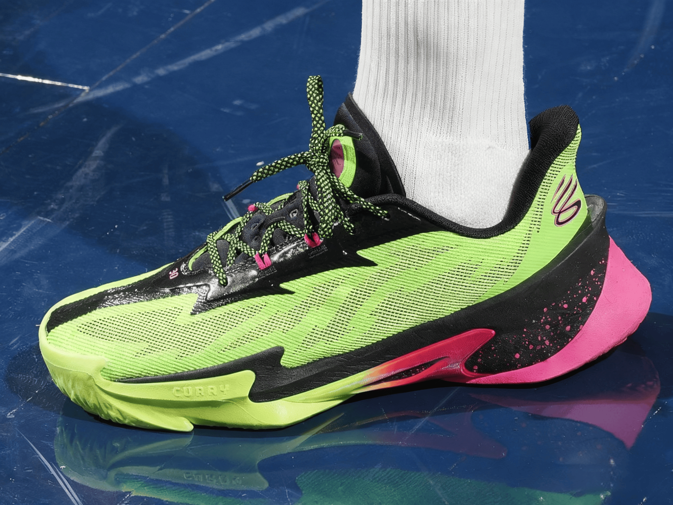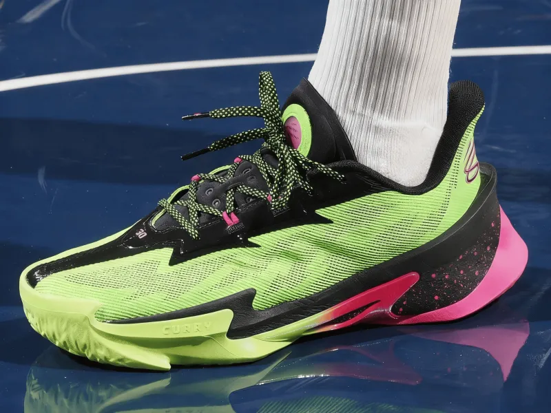 比賽中,庫里上腳綠色UA CURRY Series7。