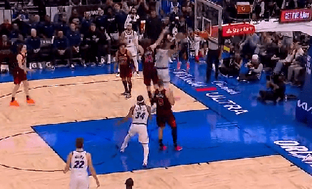 比賽的真突第四節,貝恩外線(xiàn)假傳真突,沖框沖框上籃打進(jìn)個(gè)人已砍下35分。上籃
