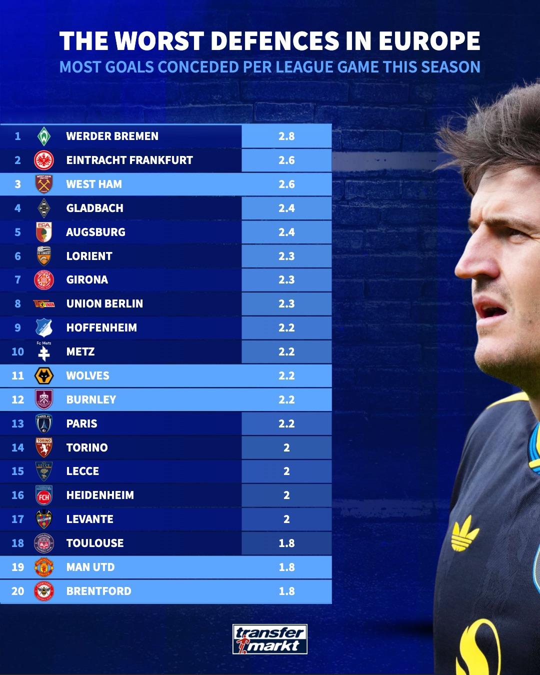 虎撲09月29日訊 德轉數據統計本賽季至今歐洲五大聯(lián)賽場(chǎng)均丟球榜,不萊梅場(chǎng)均2.8球第一,轉本曼聯(lián)場(chǎng)均丟球1.8球。場(chǎng)均