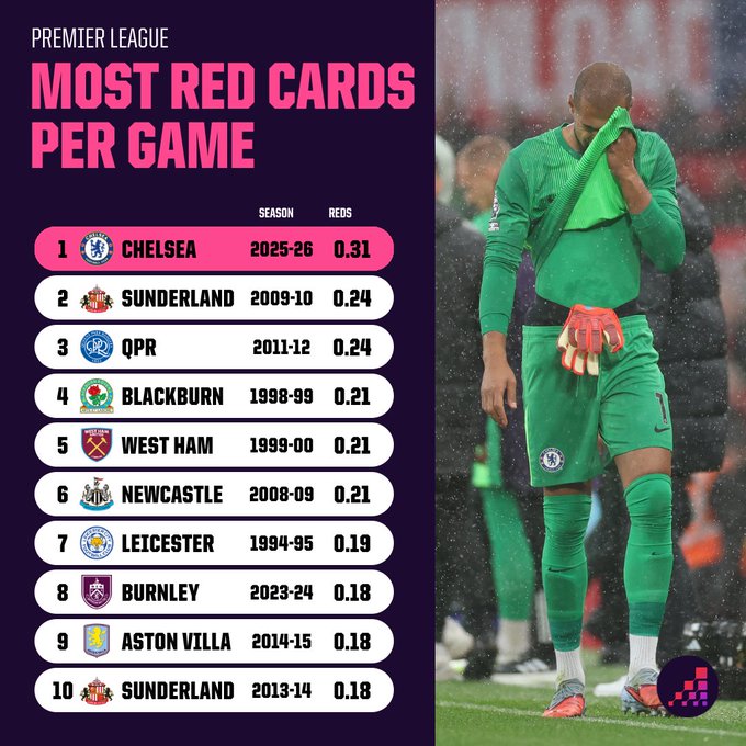 [流言板]英超歷史單賽季場(chǎng)均紅牌數:本賽季切爾西場(chǎng)均0.31張排名第1