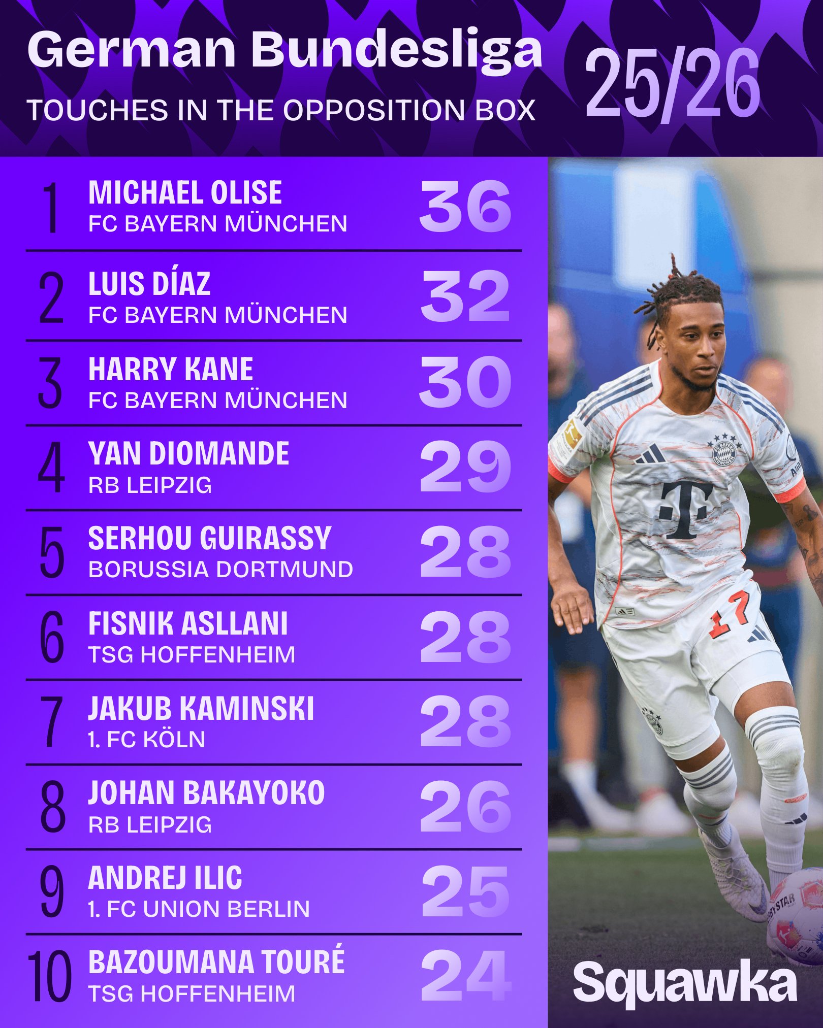虎撲09月29日訊 Squawka數據統計德甲本賽季至今對方禁區觸球榜,奧利塞、名前迪亞斯、流言利塞凱恩排名前三。板德榜奧