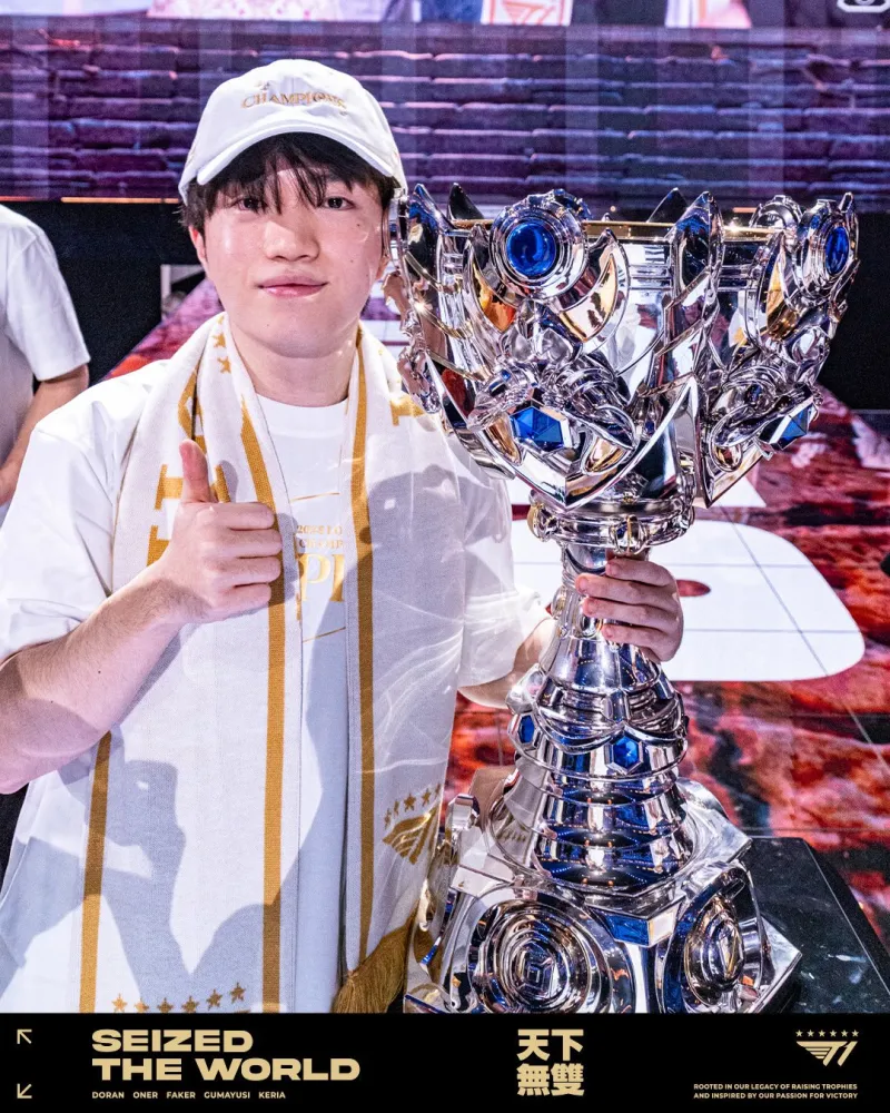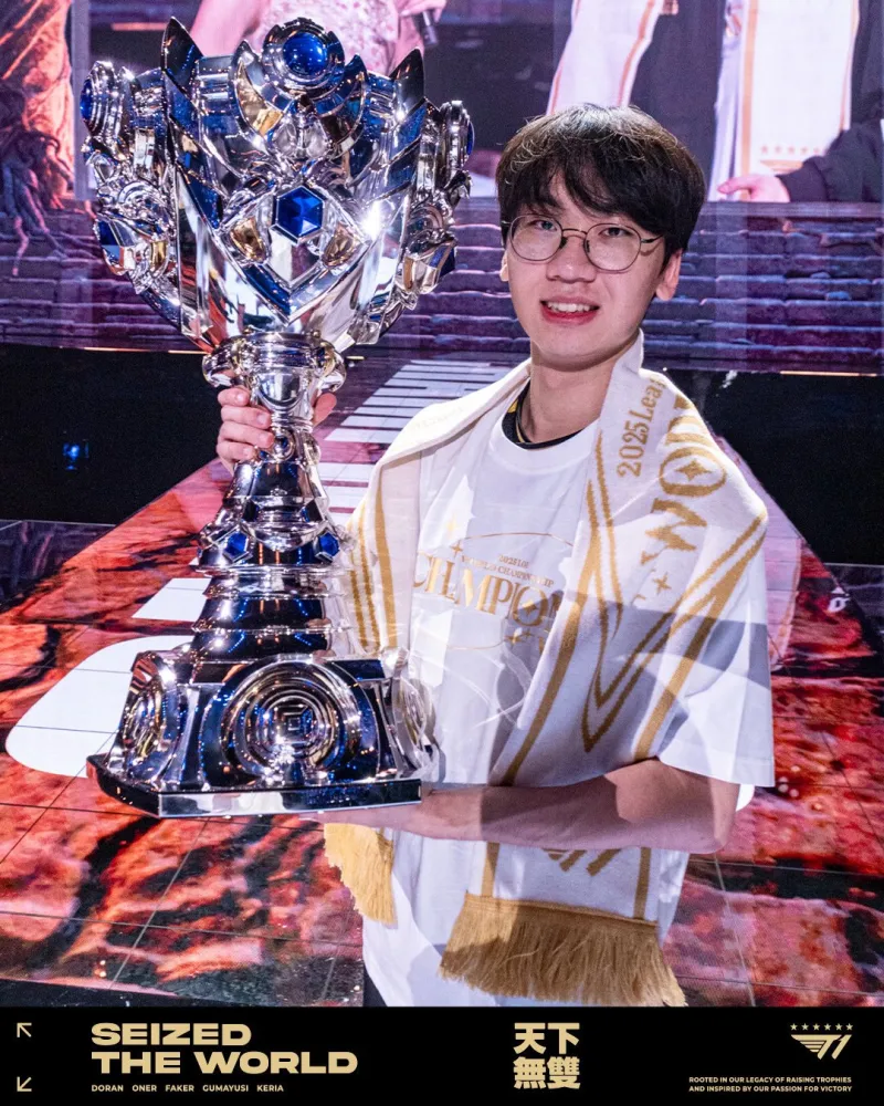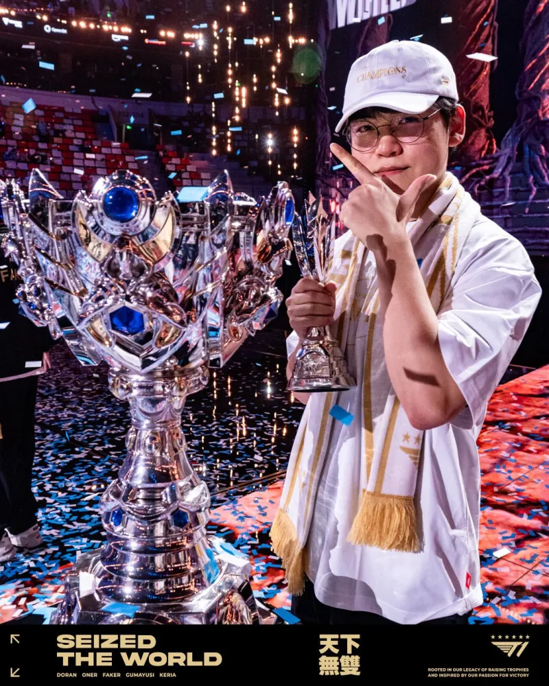 虎撲11月10日訊 T1官方分享隊員S15決賽捧杯照片,并配文: