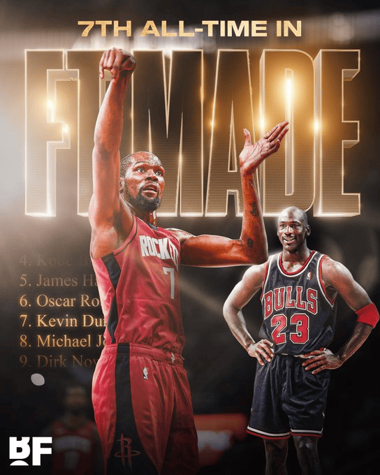 賽后,美媒Basketball Forever曬出海報:杜蘭特生涯罰球數超越喬丹獨居歷史第7位!