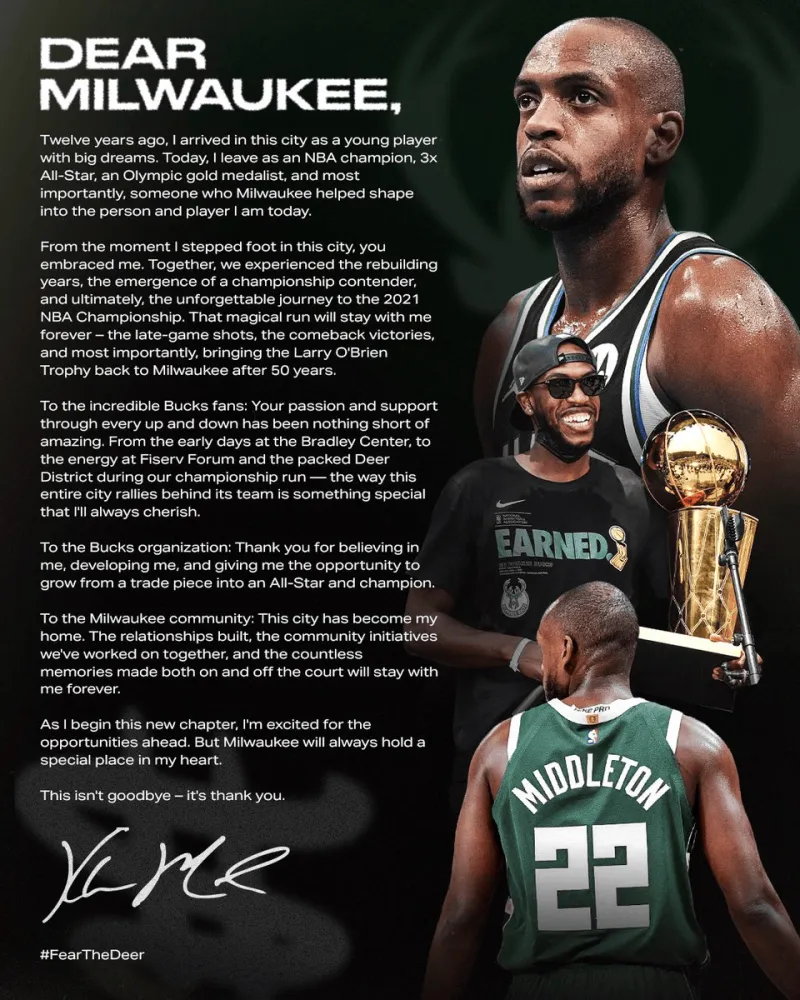 感謝雄鹿:感謝你們的信任,培養我,并給了我機會(huì ),讓我從一個(gè)交易籌碼成長(cháng)為全明星和冠軍。