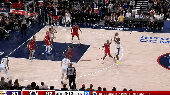 第四節比賽中,前中詹姆斯接球三分投進(jìn),砍下目前26中14砍下賽季新高32分,賽季湖人還剩3分鐘還落后快船13分。新高