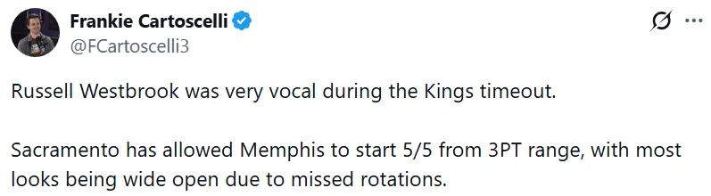 據國王記者Frankie Cartoscelli報道,因暫停指導球隊讓灰熊開(kāi)場(chǎng)即命中5記三分球(5投全中),防守其中大多數出手因防守輪轉漏人而處于完全空位的期間狀態(tài)。
