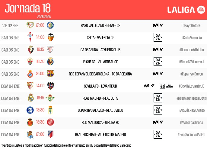 虎撲12月01日訊 西甲官方公布聯(lián)賽第18輪開(kāi)賽時(shí)間。