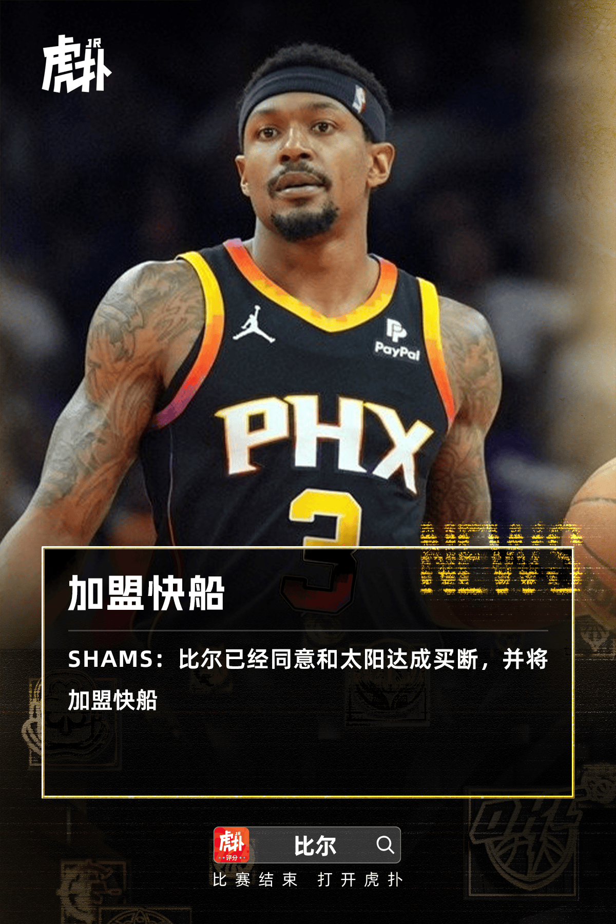 虎撲07月17日訊 根據知名記者Shams的報道,比爾已經(jīng)同意和太陽(yáng)達成買(mǎi)斷。成買(mǎi)船