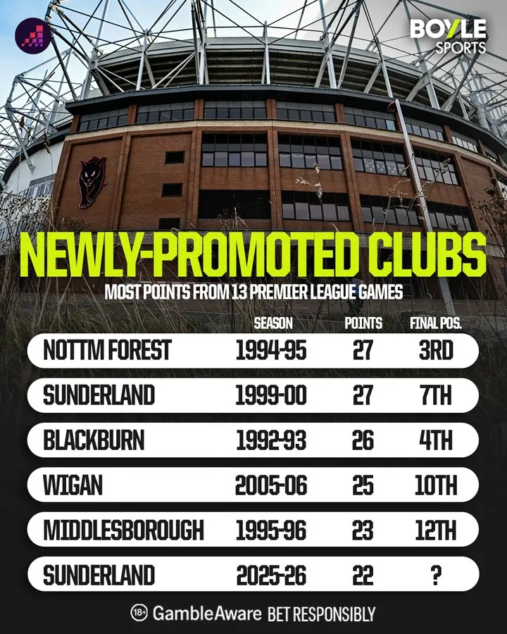 值得一提的是,桑德蘭曾在1999-00賽季同樣作為英超升班馬前13輪英超比賽取得27分,并最終收獲了聯(lián)賽第七名的成績(jì)。