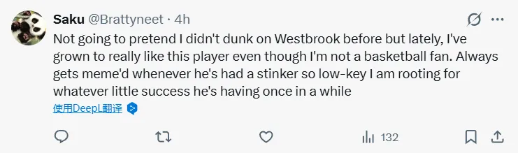 -我可不會(huì )假裝自己以前沒(méi)嘲諷過(guò)威斯布魯克,但最近我真的開(kāi)始喜歡上這位球員了,盡管我根本不是籃球迷。每次他打得糟糕時(shí)總會(huì )被刷成梗圖,所以低調地說(shuō),我其實(shí)在默默支持他偶爾取得的小成就。