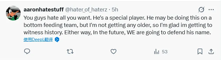 -你們盡管恨吧。他是位非凡的球員。即便效力于一支墊底球隊,我也無(wú)所謂,反正我不會(huì )變老,能見(jiàn)證歷史時(shí)刻已足夠欣慰。無(wú)論如何,未來(lái)我們定會(huì )為他的名聲挺身而出。