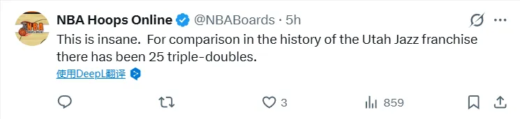 -這簡(jiǎn)直太瘋狂了。作為對比,在猶他爵士隊史中,球員僅達成過(guò)25次三雙。