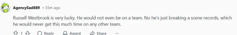 -拉塞爾·威斯布魯克真的很幸運。他本來(lái)甚至不一定能待在一支球隊里?,F在他只是在刷一些場(chǎng)景記錄,而在其他任何球隊他都不可能得到這么多上場(chǎng)時(shí)間。