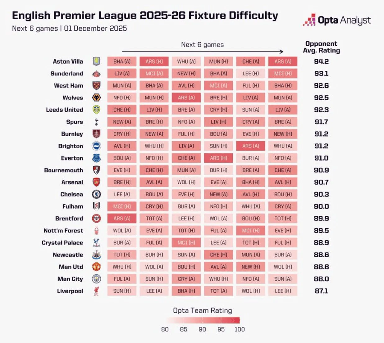 虎撲12月02日訊 著(zhù)名統計機構OPTA統計了英超接下來(lái)6輪賽程最輕松的球隊。