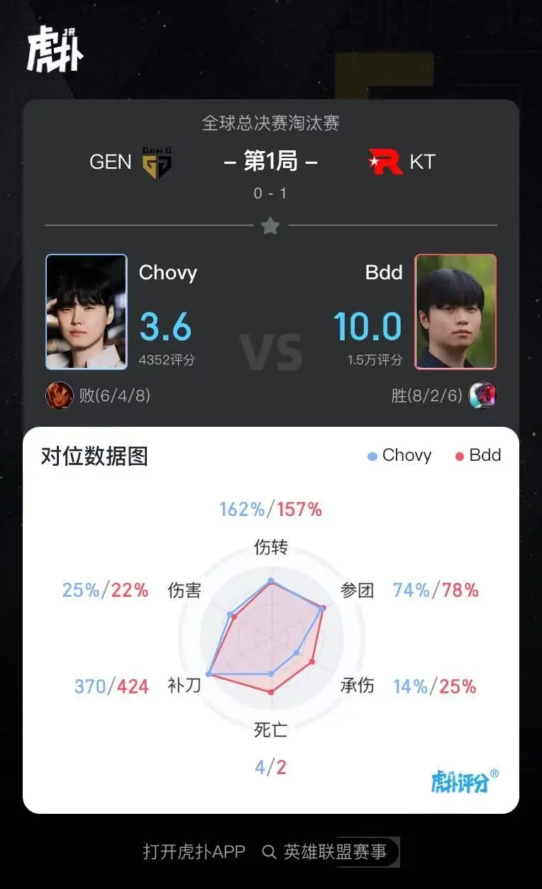 虎撲11月01日訊 在剛剛結束的KT對陣GEN的BO5比賽中,Bdd永恩打出8/2/6戰績(jì),戰績(jì)斬獲斬獲KT對陣GEN第一局MVP