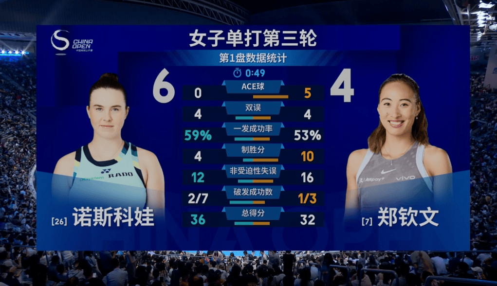 第一盤(pán)比賽,欽文鄭欽文兩次被諾斯科娃破掉發(fā)球局,流言輪鄭最終以4-6輸掉首盤(pán)。板中