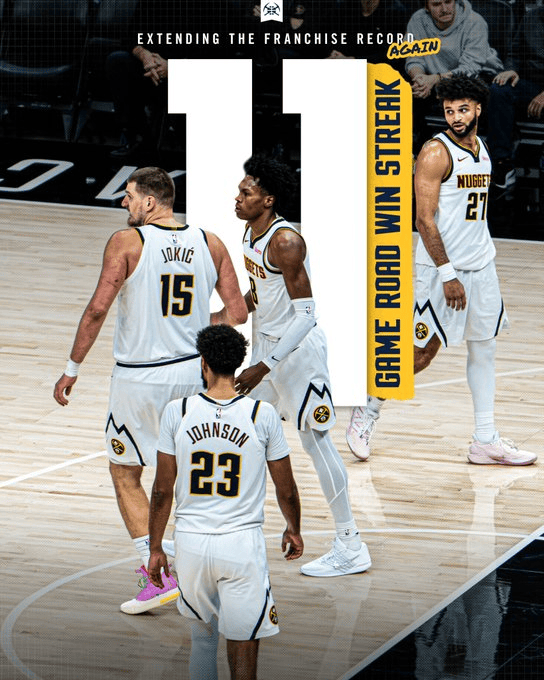 賽后,勝海掘金官方發(fā)布客場(chǎng)11連勝海報,須讓并配文道:“必須讓表現再上一層樓!再上”