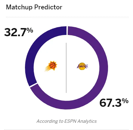 [流言板]ESPN預測明日湖人vs太陽(yáng)比賽:湖人勝率67.3%占據上風(fēng)