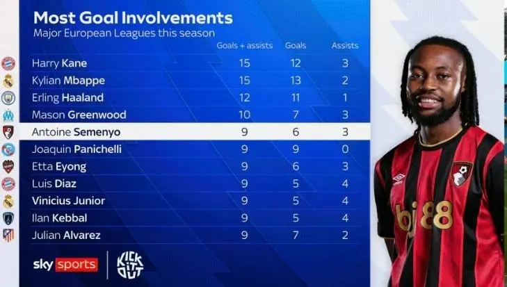 11月2日訊 天空體育盤(pán)點(diǎn)了本賽季歐洲主流聯(lián)賽球員參與進(jìn)球榜(進(jìn)球+助攻),以下為具體榜單(只統計聯(lián)賽):