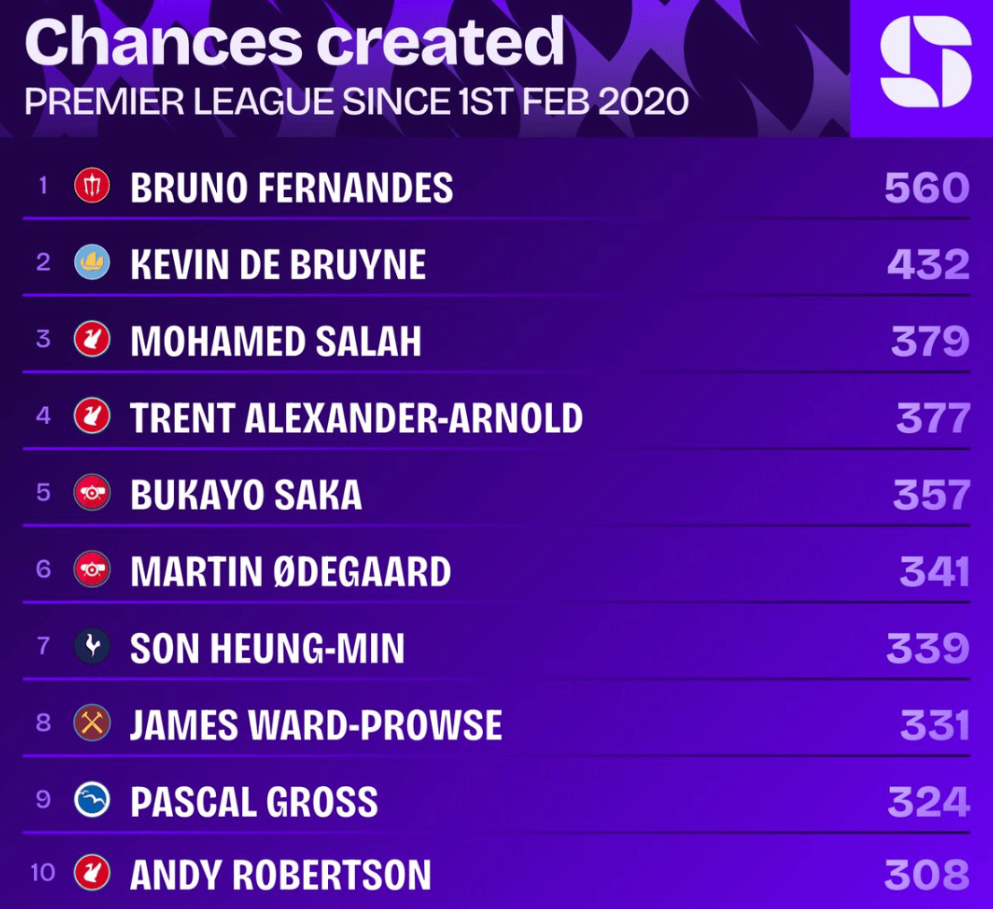 這次助攻是超近B費的英超第52次助攻,同時(shí),年創(chuàng )他在英超累計創(chuàng )造機會(huì )達560次,造機自他加盟以來(lái)高居全聯(lián)盟第一。行榜