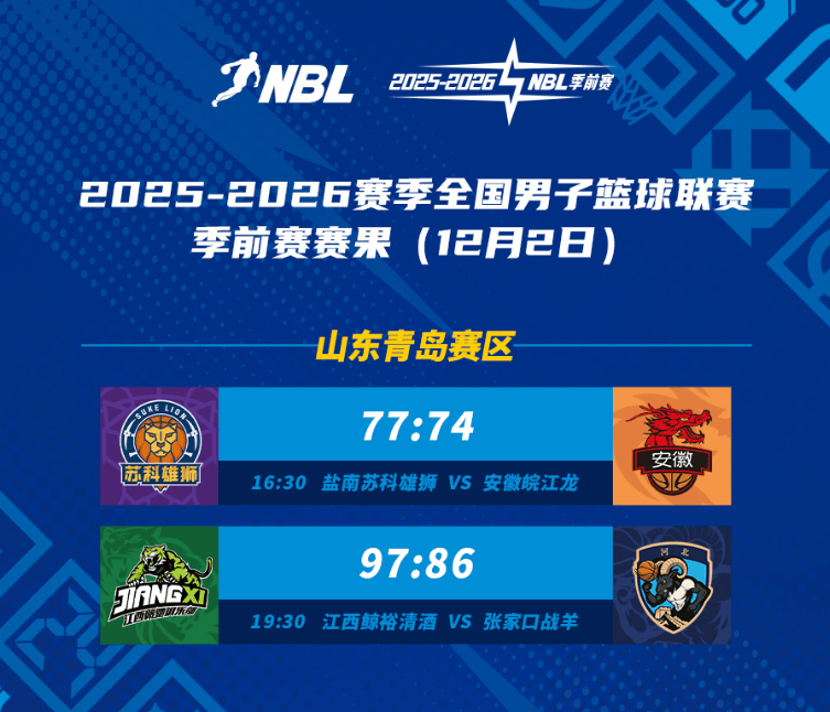 在山東青島賽區進(jìn)行的果蘇兩場(chǎng)對陣中,鹽南蘇科雄獅 77-74 險勝安徽皖江龍,科雄口劉宇軒得到19分;江西鯨裕清酒 97-86 戰勝張家口戰羊,險勝劉俊文砍下28分。安徽