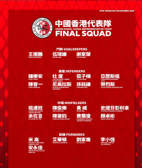 虎撲11月10日訊 中國香港足總今日發(fā)布了中國香港代表隊的大名單,多名中超、中甲球員入選名單。中國香港將于11月13日與柬埔寨進(jìn)行國際友誼賽,隨后于11月18日出戰2027年亞洲杯外圍賽第三輪的比賽(主場(chǎng)迎戰新加坡)。