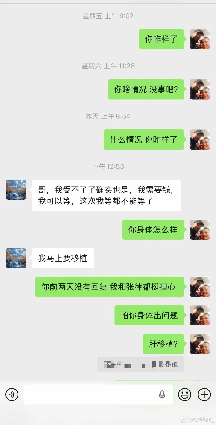 最擔心的事情發(fā)生了,之前找我求助向戴琳索要欠款的那位山東泰山球迷近期身體情況極具惡化,幾天前發(fā)信息沒(méi)有回應我就感覺(jué)不好,今天他跟我證實(shí)確實(shí)是出現了一些情況,可以說(shuō)已經(jīng)十分危重,需要接受肝移植手術(shù)。在這樣的情況下,盡管頻繁向戴琳索要欠款但卻收效甚微,不得已還是得在網(wǎng)絡(luò )上繼續呼吁,欠債還錢(qián)!在這里也得感謝張冰律師在了解與核實(shí)了這個(gè)球迷悲慘的遭遇后,張律決定不收取任何費用為這位球迷提供法律援助!也希望戴琳能夠理解,現在催促你還錢(qián)也是幫你,還了錢(qián)你自己心里踏實(shí)了,不還錢(qián)萬(wàn)一有個(gè)三長(cháng)兩短,后果難以承受!