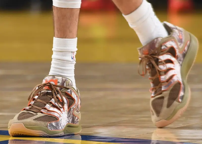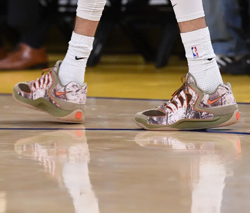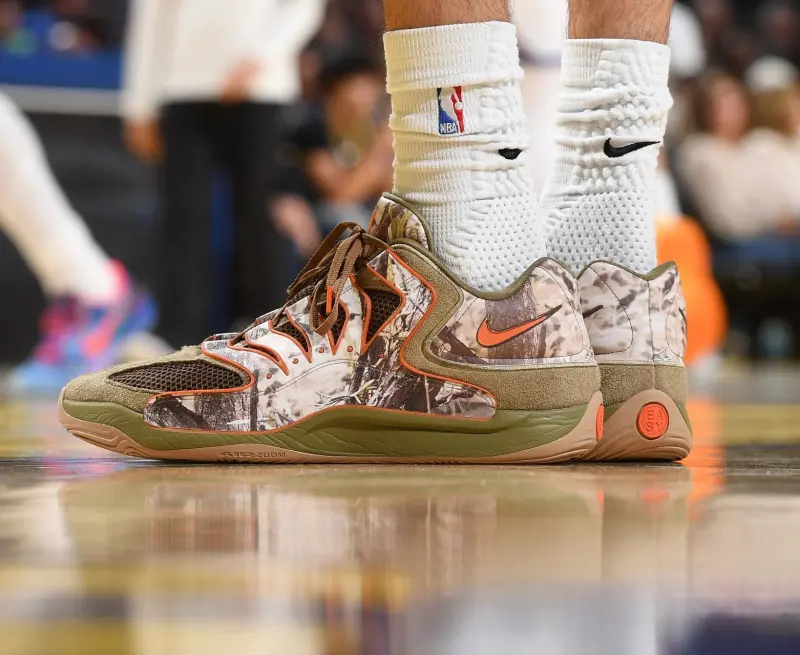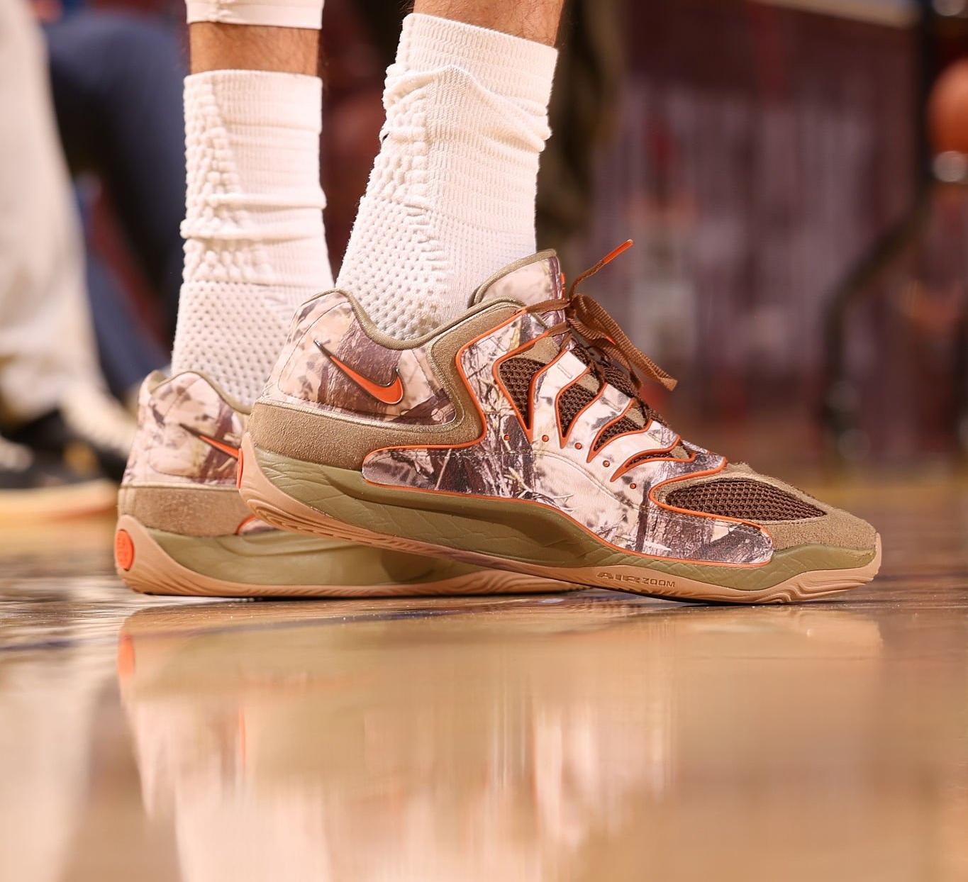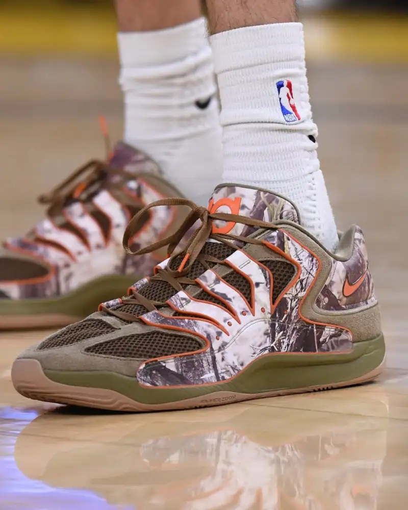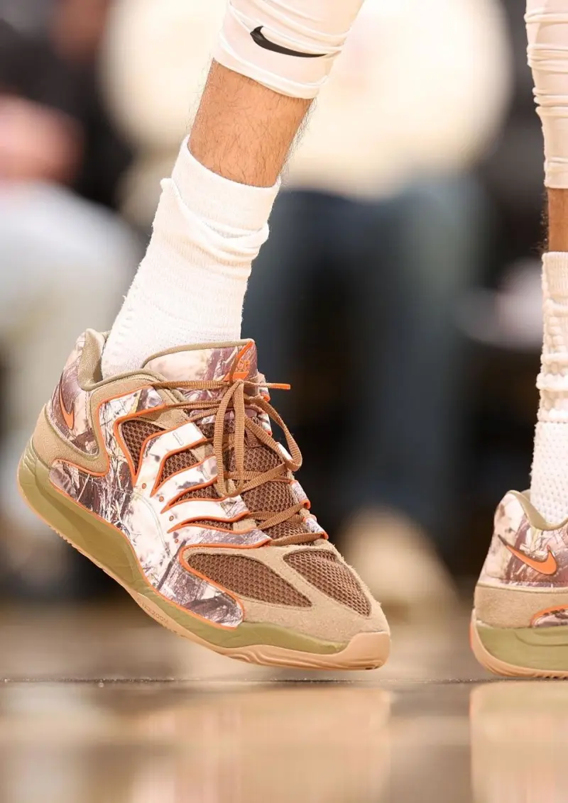 比賽中,霍姆格倫上腳個(gè)人專(zhuān)屬迷彩褐色Nike KD18 PE。