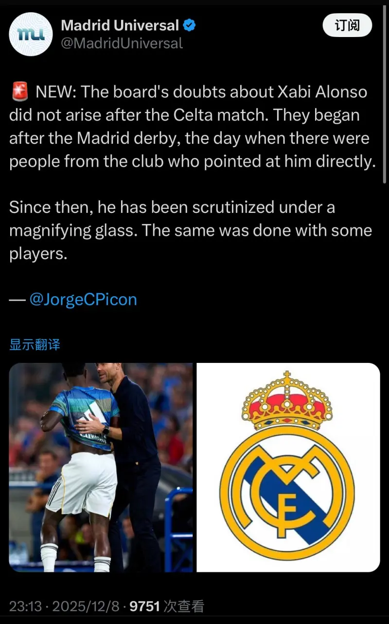皇馬跟隊JorgeCPicon:俱樂(lè )部董事會(huì )并非在輸給塞爾塔之后才開(kāi)始質(zhì)疑哈維·阿隆索。實(shí)際上,這種質(zhì)疑始于馬德里德比之后,當天就有俱樂(lè )部?jì)炔咳耸恐苯訉λ岢雠u。