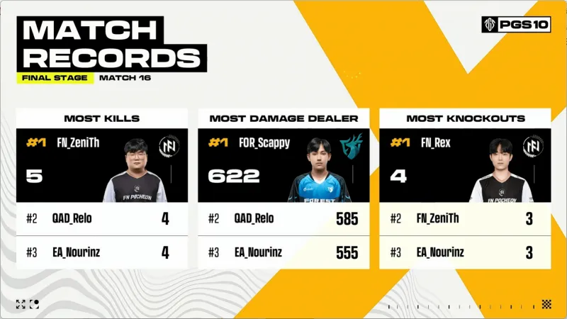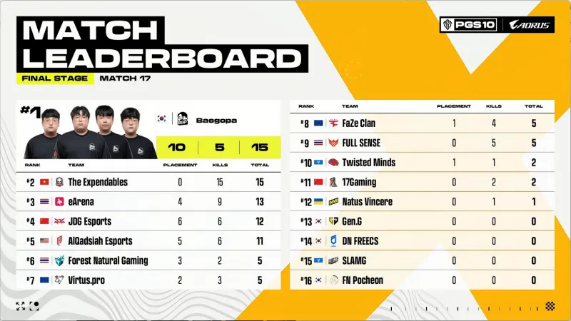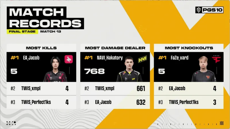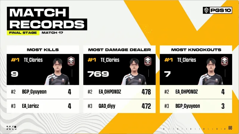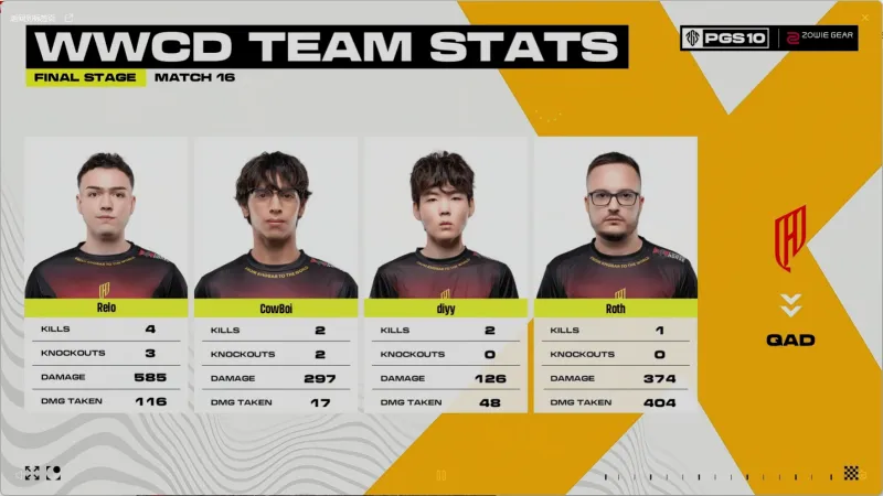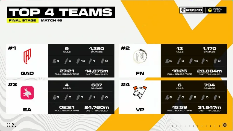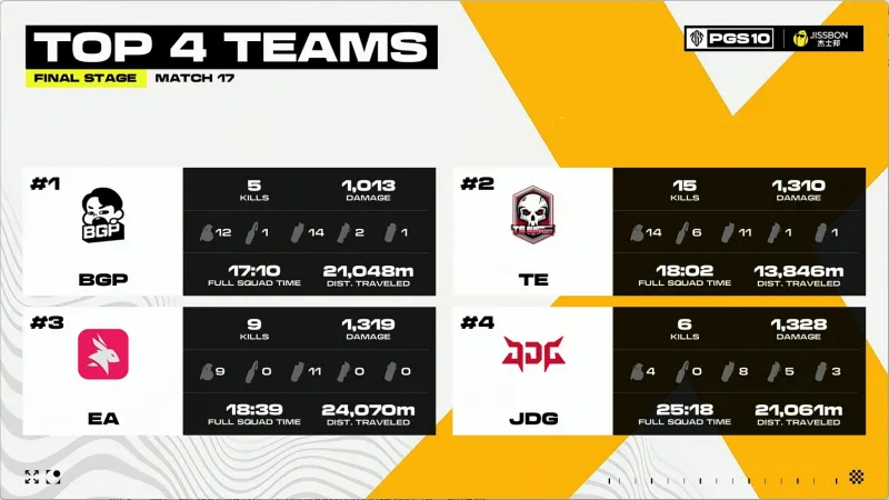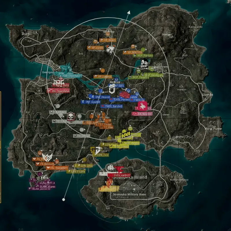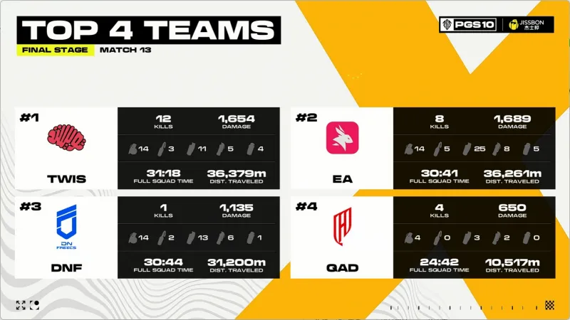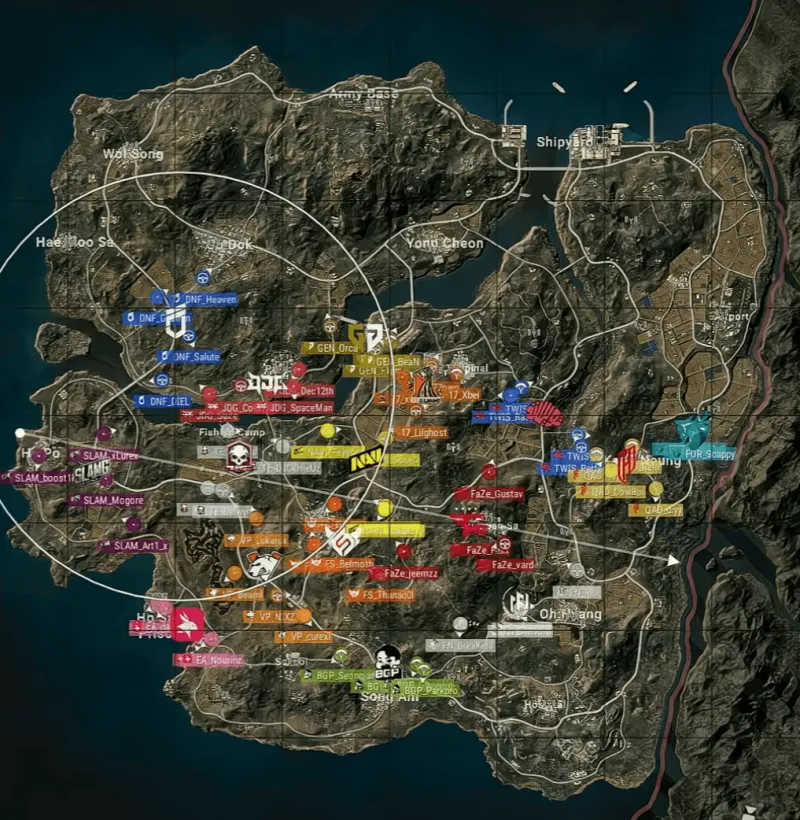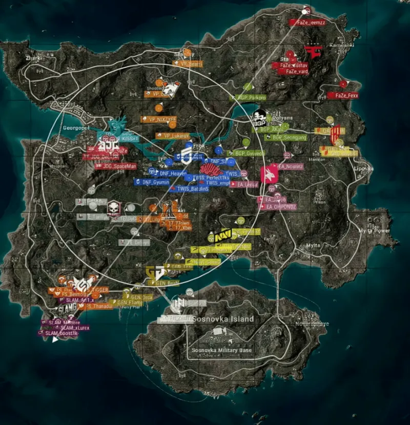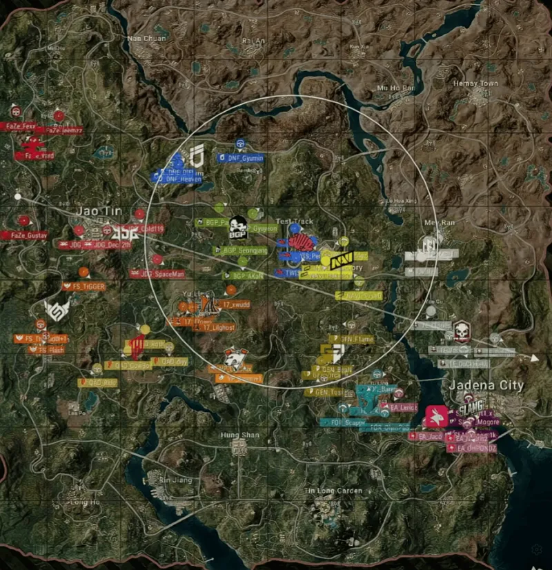 階段7,賽后TWIS也清掉QAD殘編,決賽居亞軍EA和BGP在圈型南側長(cháng)條房交火,分奪DNF則在側翼勸架。賽后