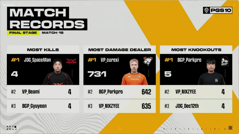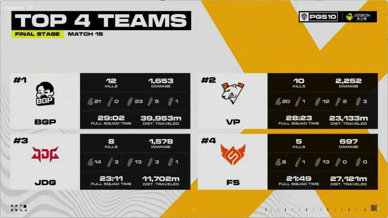 階段8,BGP炸倒VP一人,隨后VP掛后隊員也加入正面戰場(chǎng),BGP率先補掉VP倒地隊員,隨后兩隊再度1換1,但VP完成扶人,場(chǎng)上變?yōu)?V3。