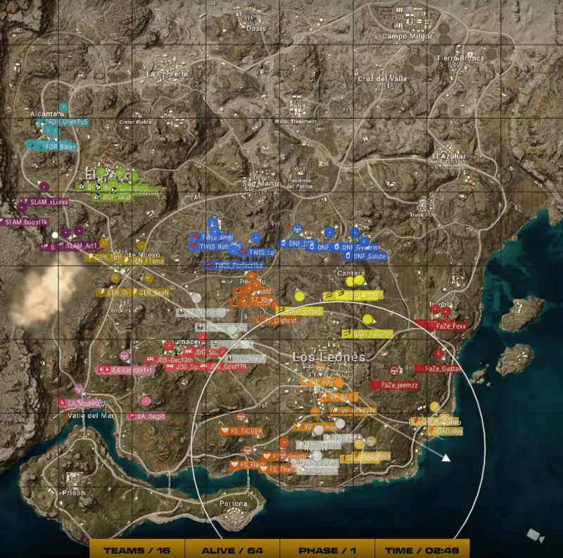 階段6剩余8隊,SLAM獨狼藍圈外出局,JDG獨狼被FS淘汰,FS進(jìn)圈被FN和17卡住,17進(jìn)圈被多隊卡掉,FN也被打掉2人,EA和VP獨狼存活。