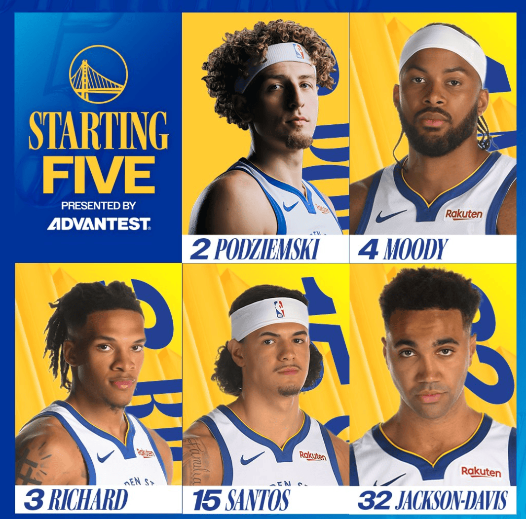 賽前,勇士官方公布了球隊本場(chǎng)首發(fā)陣容:布蘭丁-波杰姆斯基、摩西-穆迪、威爾-理查德、吉-桑托斯和特雷斯-杰克遜-戴維斯。
