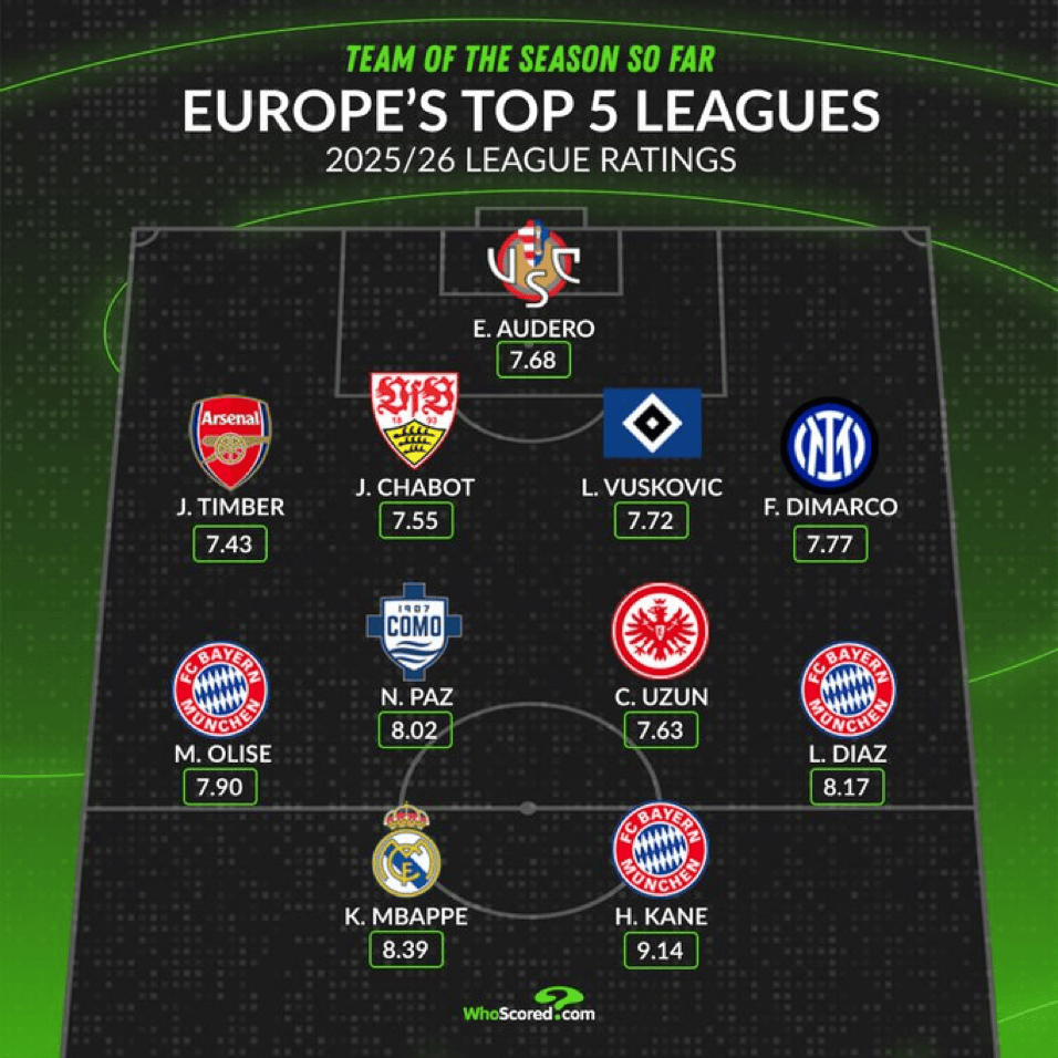 虎撲10月08日訊 Whoscored依照球員的場(chǎng)均評分,羅列出了本賽季五大聯(lián)賽目前的賽季賽目最佳陣容。