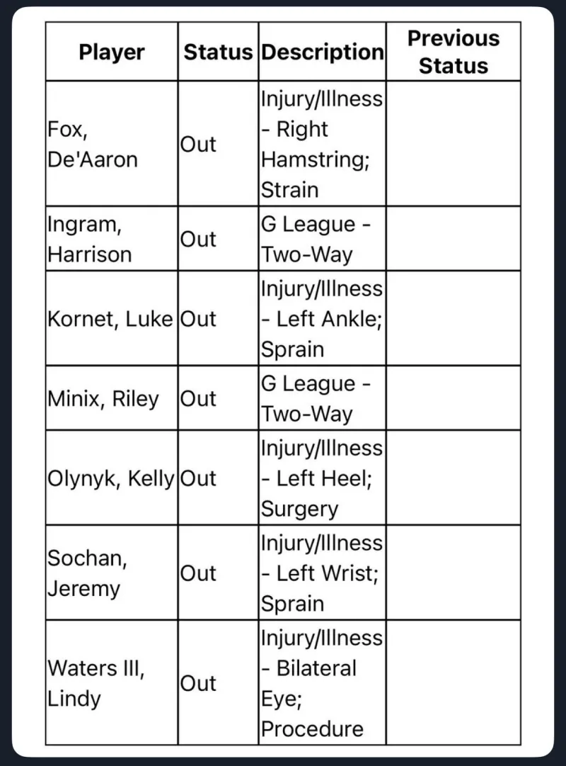 馬刺隊傷情名單無(wú)更新。??怂?、傷病索漢、更新科內特、奧利尼克和沃特斯三世將確認缺席明日客戰太陽(yáng)隊的比賽。