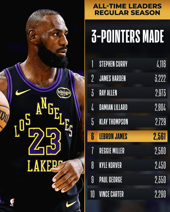 據統計,板詹詹姆斯生涯已命中2561記三分球,生涯超越雷吉-米勒獨占歷史第六,該榜單第一名為斯蒂芬-庫里4116記三分球。
