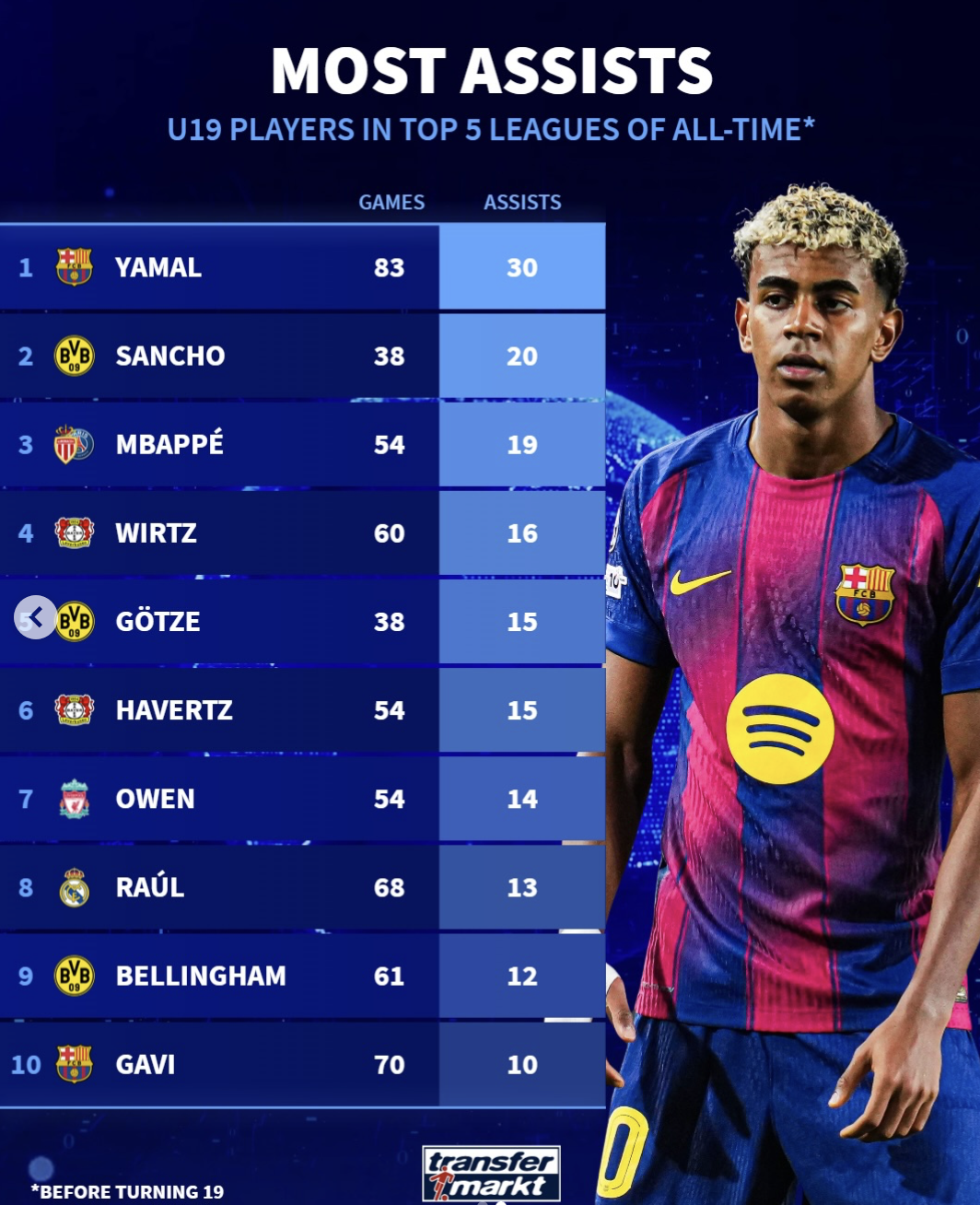 虎撲12月02日訊 德轉統計了球員滿(mǎn)19歲之前五大聯(lián)賽助攻榜。