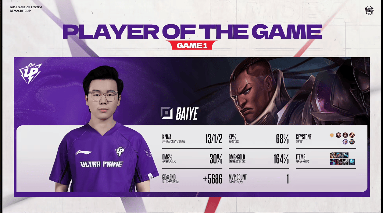 虎撲12月18日訊 在剛剛結束的UP對陣WE的BO3比賽中,Baiye盧錫安打出13/1/2戰績(jì),對E第斬獲UP對陣WE第一局MVP