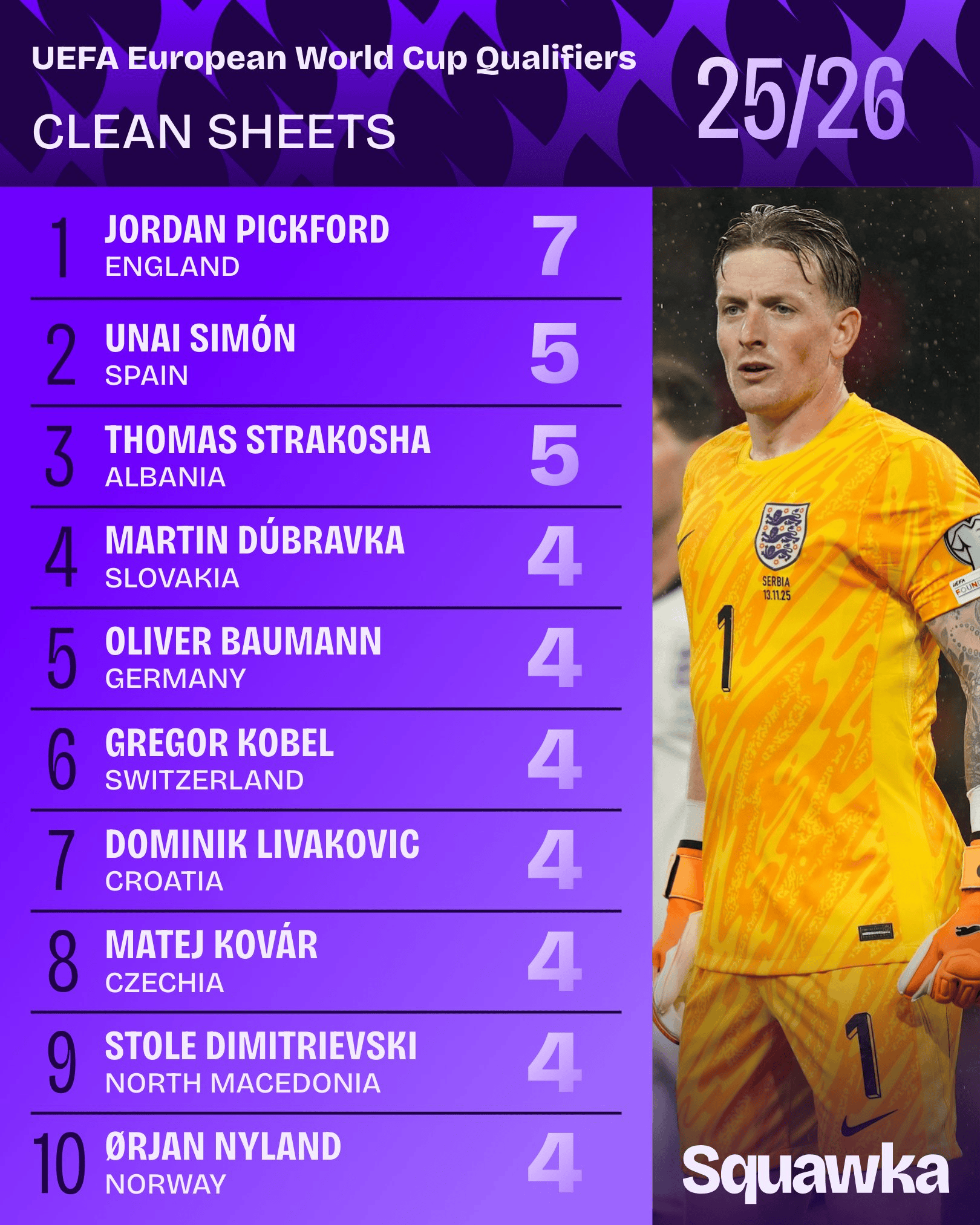 數據網(wǎng)站squawka更新了本屆世歐預的歐預零封榜。