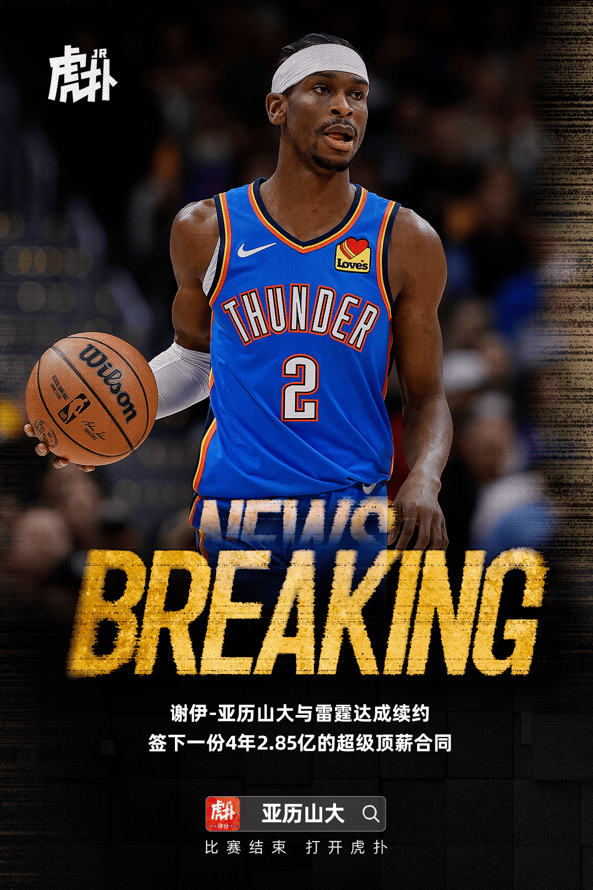 虎撲07月01日訊 根據知名記者Shams Charania的報道,雷霆以一份4年2.85億超級頂薪合同與謝伊-吉爾杰斯-亞歷山大完成續約。板歷