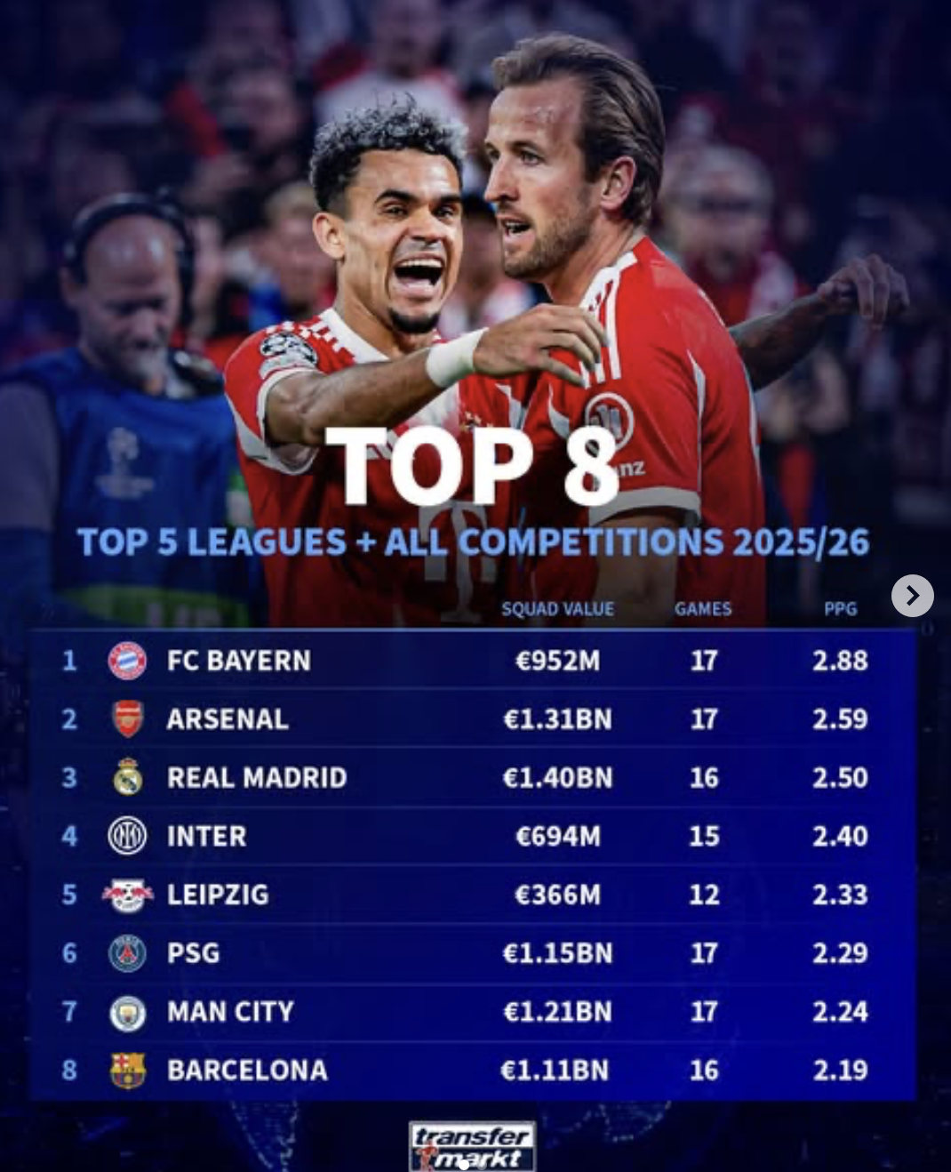 1. 拜仁(9.52億):17場(chǎng);場(chǎng)均2.88分
