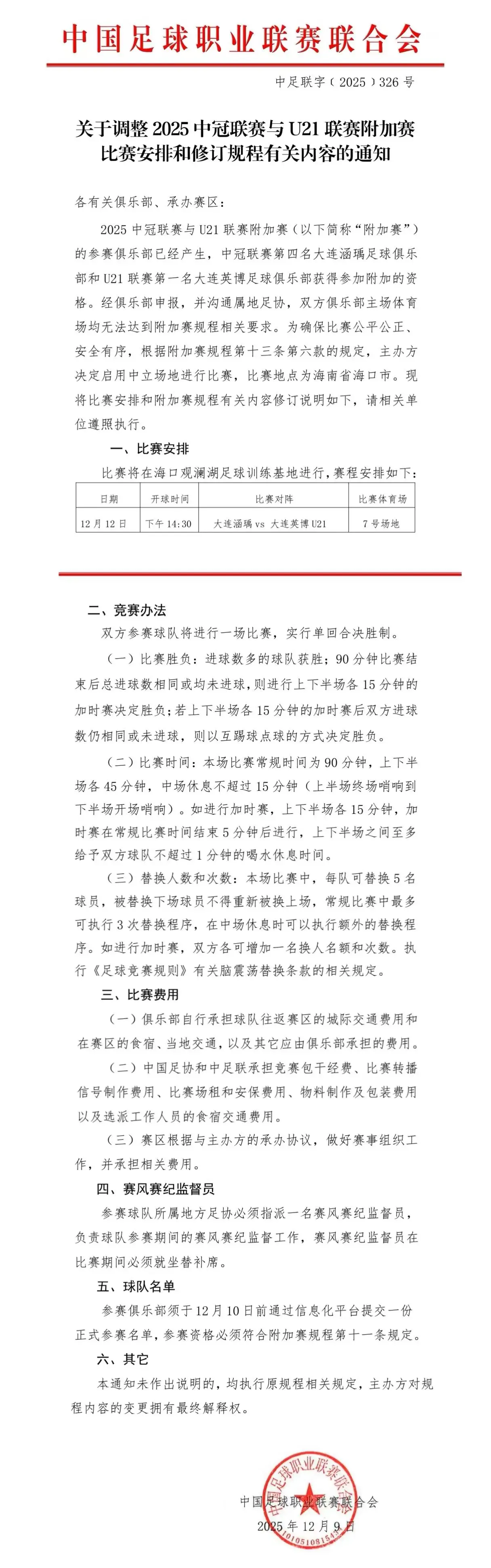 虎撲12月09日訊 本賽季U21聯(lián)賽已經(jīng)結束,最終大連英博U21獲得了聯(lián)賽冠軍。至此,2025中冠聯(lián)賽與U21聯(lián)賽附加賽的參賽俱樂(lè )部已經(jīng)產(chǎn)生,中冠聯(lián)賽第四名大連涵瑀足球俱樂(lè )部和U21聯(lián)賽第一名大連博英足球俱樂(lè )部獲得參加附加的資格。經(jīng)俱樂(lè )部申報,并溝通屬地足協(xié),雙方俱樂(lè )部主場(chǎng)體育場(chǎng)均無(wú)法達到附加賽賽程相關(guān)要求。為確保比賽公平公正、安全有序,根據附加賽規程第十三條第六款的規定,主辦方?jīng)Q定啟用中立場(chǎng)地進(jìn)行比賽,比賽地點(diǎn)為海南省??谑?,并且比賽調整為單回合制,勝者將征戰下賽季中乙聯(lián)賽。