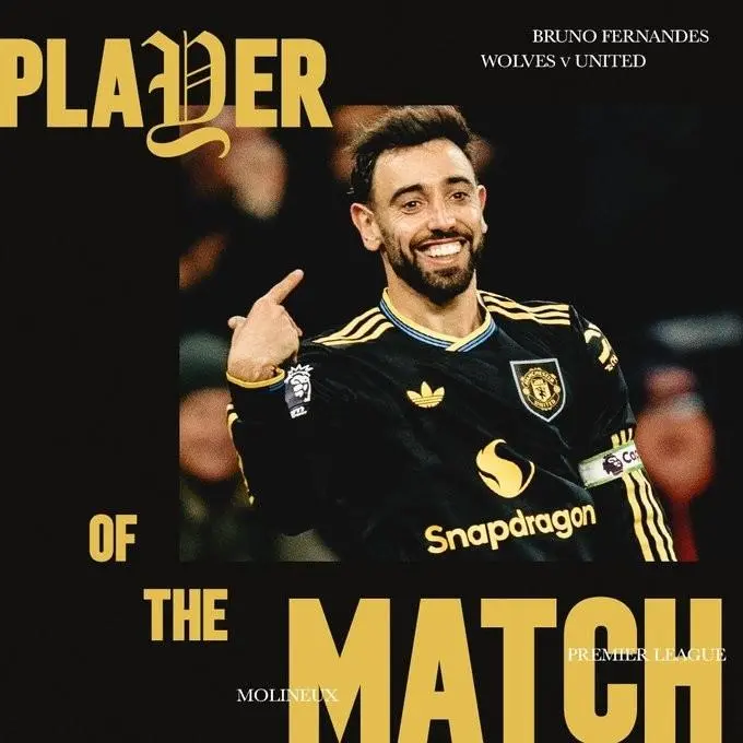 曼聯(lián)官方宣布,B費當選曼聯(lián)4-1狼隊的當選隊內最佳球員。